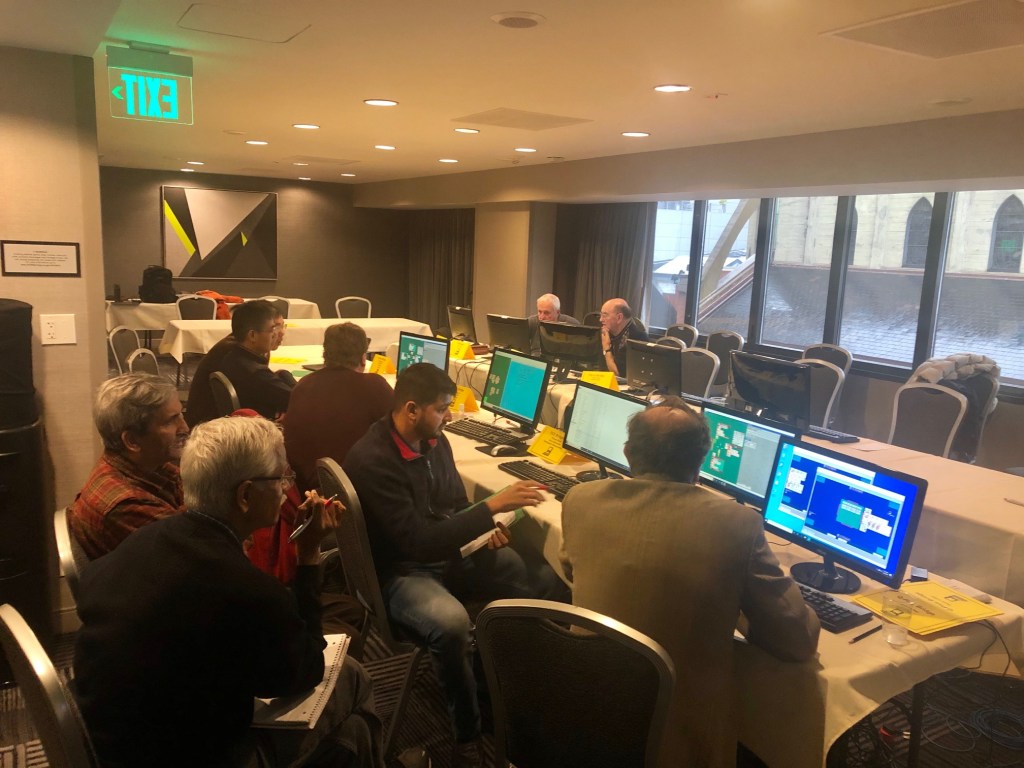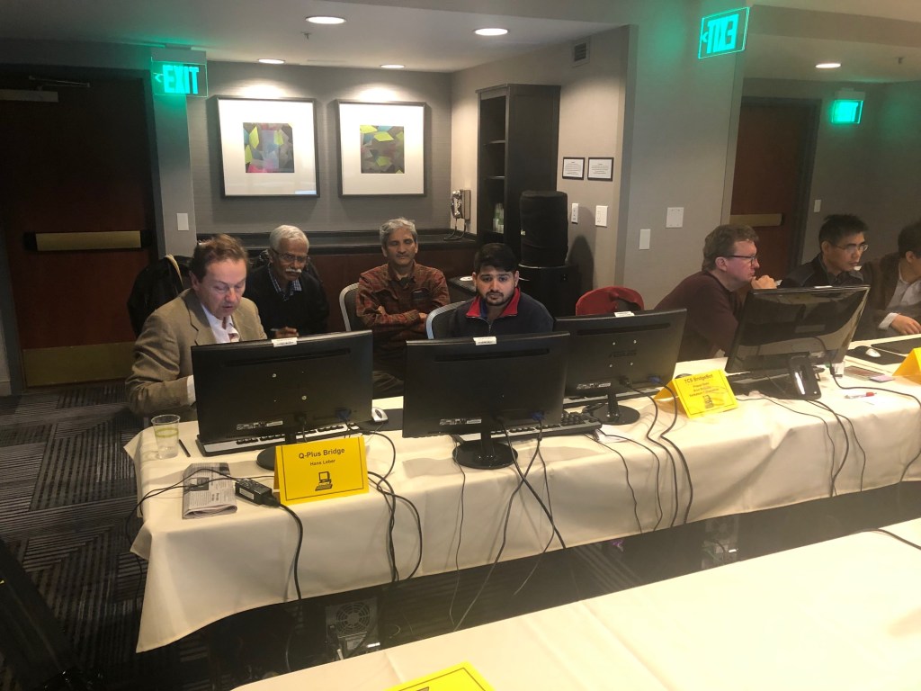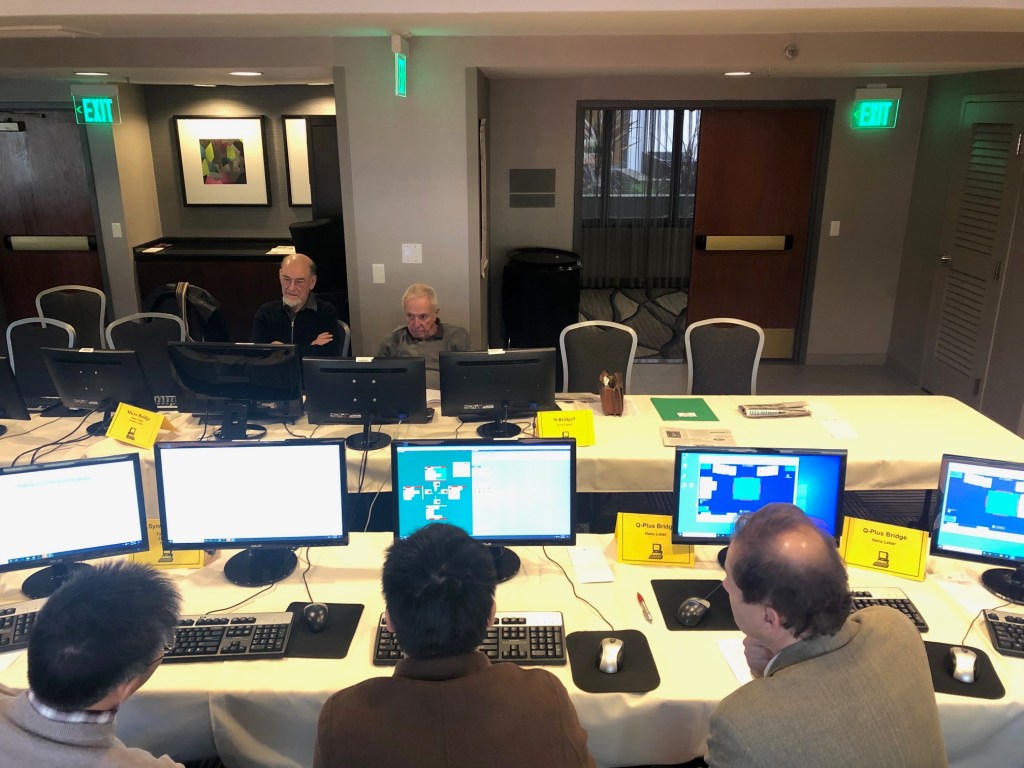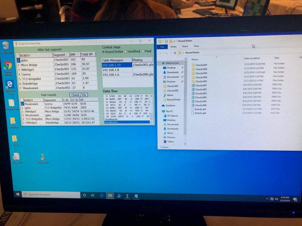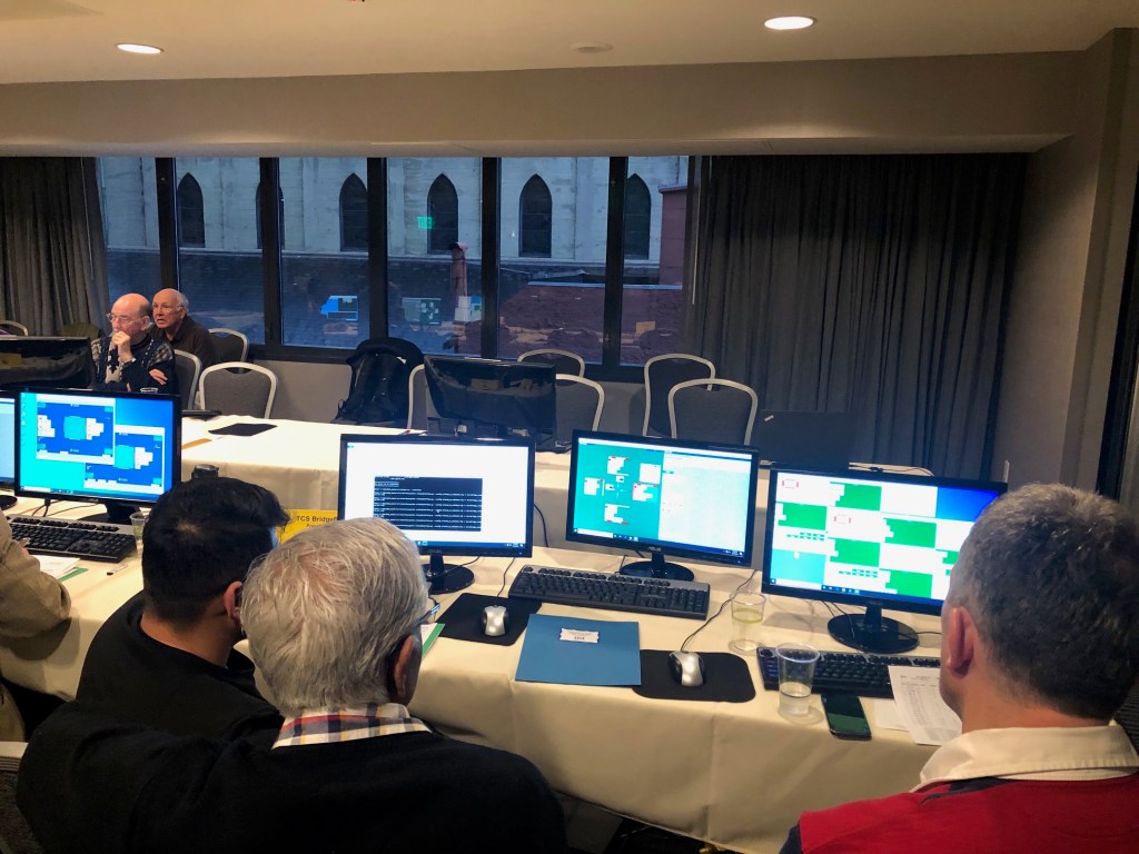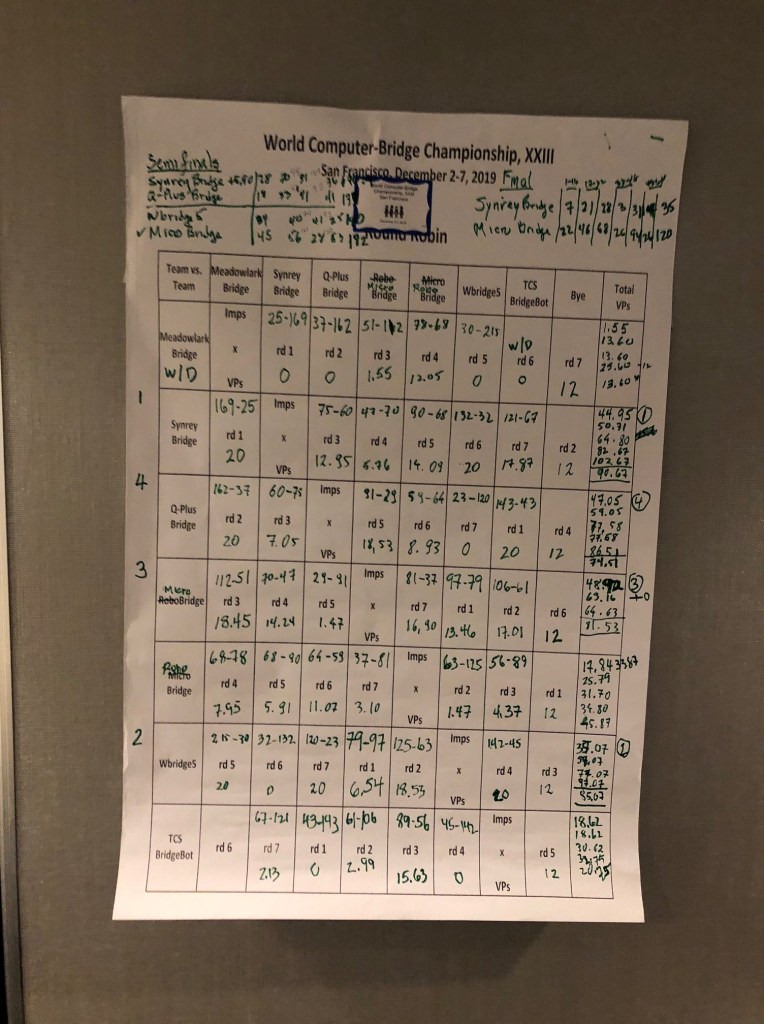 Deep in thoughtSemifinal Synrey Bridge vs Q-Plus Bridge, 4 bots on 4 computers, with central serverBridge Monitor monitoringStephen Smith is back…working for Lyft headquartered in San FranciscoMedal waiting to be presentedThe game roomWatching the action on the big screenAll the match scores, Its official, Micro Bridge wins!Micro Bridge takes Gold for first time, Synrey Bridge takes Silver third year in row. Wbridge5, Yves Costel developer and Q-Plus Bridge, Hans Leber developer settle for Bronze. Gérard Joyez, developer of Bridge Monitor, accepts the Gold Medal for Micro Bridge, Tomio Uchida developer.